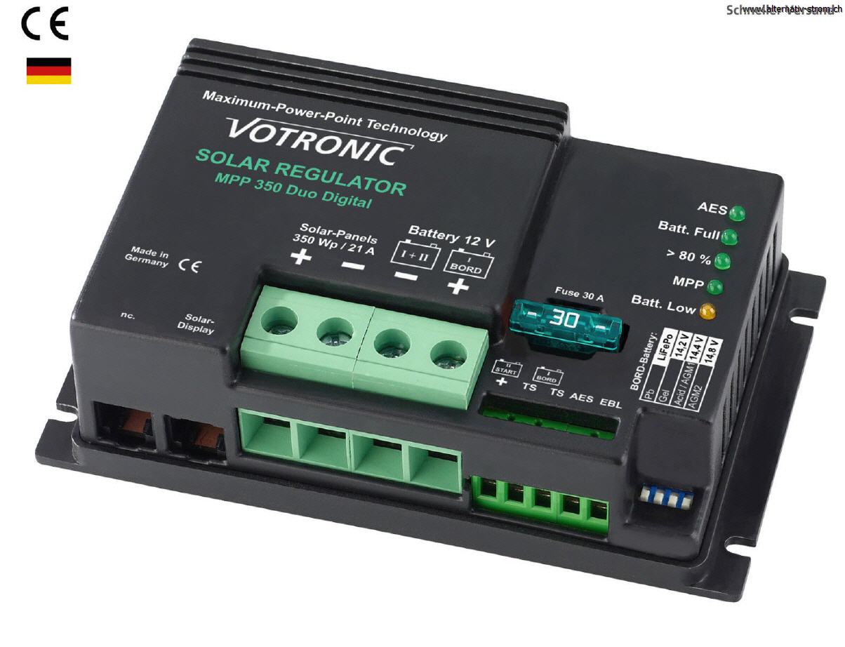 Die Votronic MPP Laderegler werden in Deutschland gefertigt und gehören zu den leistungsstärksten und zuverlässigsten Ladereglern auf dem Markt. Die MPP Reihe von Votronic arbeitet mit dem Maximum-Power-Point-Tracking Prinzp. Bei der MPP-Technologie ermittelt der Regler immerzu automatisch mehrmals pro Sekunde die maximale Leistungsausbeute der Solar-Module. Er transformiert dann den Spannungsüberschuss des Solar-Moduls um auf einen höheren Ladestrom für die Batterie (verwirklicht durch Hochfrequenz-Schaltreglertechnologie mit hohem Wirkungsgrad). Dieser Ladestromzugewinn sorgt für kürzere Ladezeiten und die bestmögliche Leistungsausnutzung der Solaranlage.
