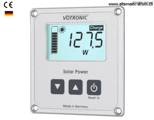 Übersichtlich und per Tastendruck leicht bedienbar werden die Messwerte zur besseren Kontrolle und Nutzung der Solar-Anlage auf dem Display dargestellt. Dabei ist die aktuelle Solarleistung stets auch als Balkenanzeige dargestellt und ermöglicht die Kontrolle auf einen Blick. Die Anzeige ist hinterleuchtet (schaltbar) und auch aus grösseren Entfernungen sowie bei allen Lichtverhältnissen sehr gut ablesbar.
